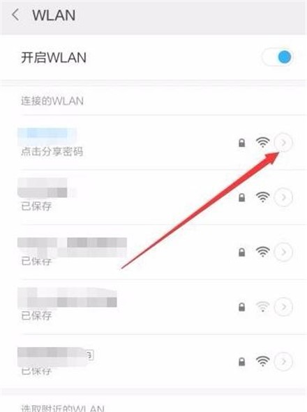 3、进入到WLAN的操作界面后,找到页面中正在连接的Wifi,点击信息菜单项后面的按钮,打开,如图所示: